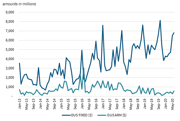 Fixed-rate DUS issuance over the last 18 months has been averaging $5.3 billion a month with DUS ARM issuance of $400 million. Historically, DUS ARM issuance averaged more than $1 billion monthly from 2015 to 2017, but issuance began to decline in early 2018 and has been fairly low since mid-2019.