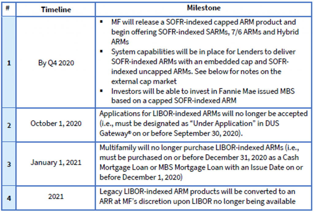 The transition to SOFR-indexed multifamily loans at Fannie Mae is official. The GSE will no longer accept applications for LIBOR-indexed ARMs as of September 30, 2020. The complete timeline for the transition in multifamily loans and securities is shown in Table 1.