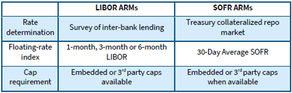 The buyers of the new SOFR-indexed DUS ARM pools reportedly included some of the Federal Home Loan Banks, a group that began stepping back from all LIBOR markets in 2018 and 2019. The Federal Housing Finance Agency in 2019 formally instructed the FHLBanks to stop investing in LIBOR-indexed assets that matured after 2021, the scheduled expiration for LIBOR. The FHLBanks stopped investing not only in LIBOR-indexed securities but also in securities with underlying LIBOR-indexed loans. The new SOFR-indexed DUS backed by SOFR-indexed loans puts the FHLBanks back in play.