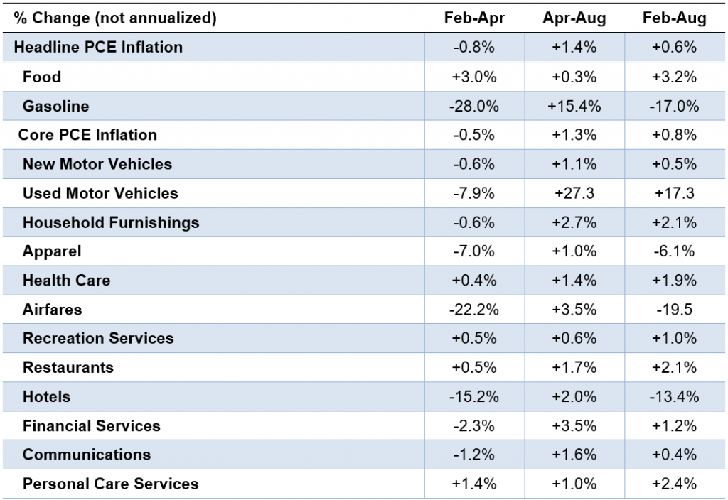 Generally, prices sank in March and April when huge chunks of the economy shut down before beginning to rebound in May when economies started to reopen. Components of inflation changed significantly over the six months through August, the most recent data available (Exhibit 1).