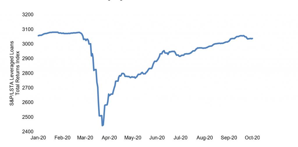 Loan returns rose steadily between July and mid-September before taking a breather into early October (Exhibit 1). The index has now remained at its pre-coronavirus level. After accounting for the various reporting dates of managers, the S&P/LSTA Index gained 4% between July and September. Managers held portfolios with an average beta of 1.04, which meant the average manager should have gained 4.14%. With actual average performance of 4.27%, the average manager outperformed the index by 0.13%.