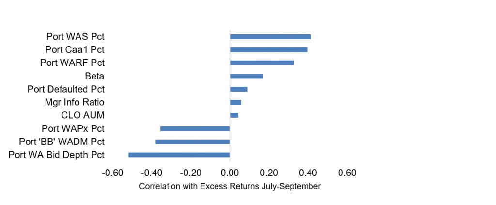The weighted average spread and bid depth of the portfolio correlated most strongly with recent excess returns (Exhibit 3). Managers who held loans that have wider spreads or receive fewer bids delivered higher returns. Additionally, higher exposure to ‘Caa1’ and lower weighted average loan price correlated with more recent excess returns. These relationships indicate that managers holding riskier loans continued to outperform between July and September.