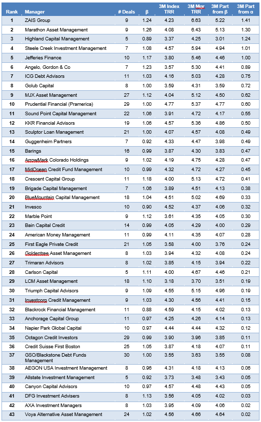 A total of 43 managers delivered positive alpha in the market between July and September (Exhibit 5). The Top 5 included ZAIS, Marathon, Highland, Steele Creek and Jefferies Finance.
