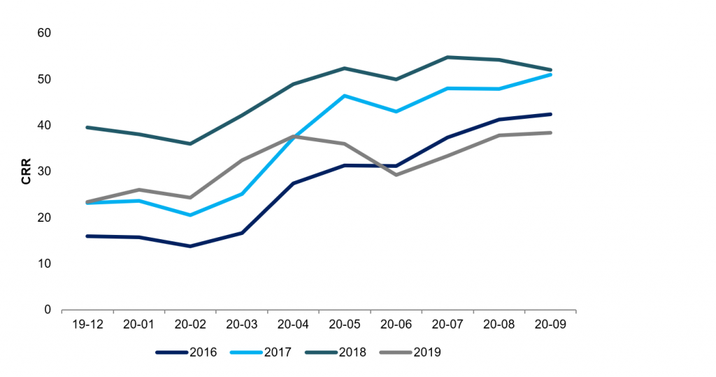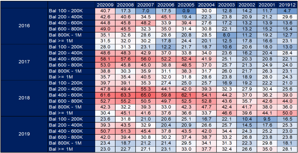 Elevated jumbo conforming speeds appear, in some part, to be driving faster speeds in seasoned collateral. As jumbo loans in seasoned trusts have paid down through amortization and curtailment, the population of jumbo conforming loans in these trusts is much larger than those of newer vintage deals. As of September, the 2017 vintage has the largest population of loans with balances between $400,000 and $600,000, making up 42% of all loans in the cohort. By comparison, loans with those balances make up just 25% of the 2019 and 2020 vintages. Conforming jumbo loans from 2017 prepaid at 58 CRR last month while similar loans in the 2018 vintage paid 61 CRR. By comparison, loans with balances greater than $1 million prepaid at 35 CRR and 30 CRR in the respective cohorts (Exhibit 2).