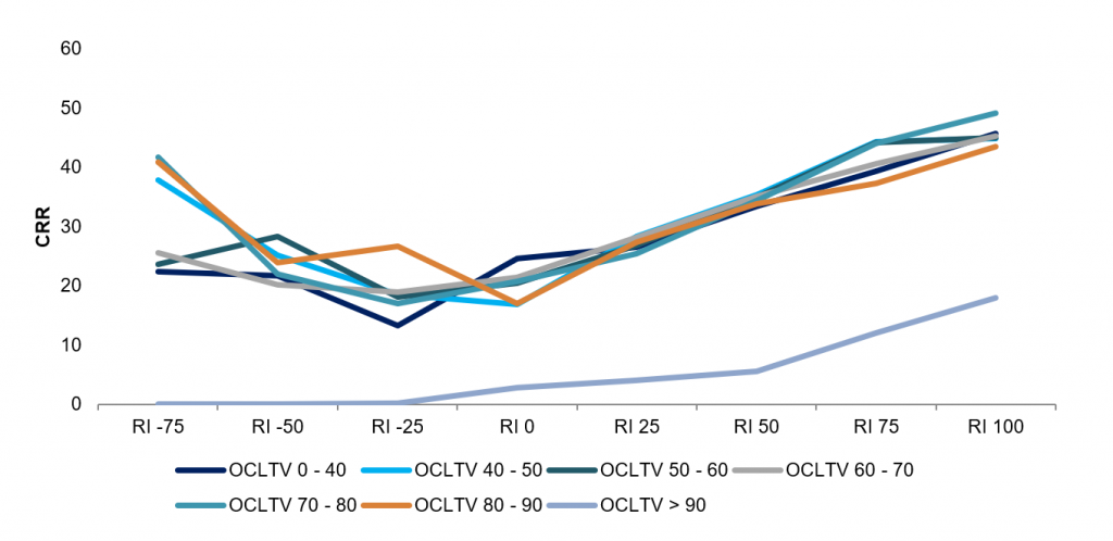 Given the lack of prepayment protection afforded by loan balance and seasoning, investors may have to look to more nuanced stories to find some protection from continued elevated prepayments. One potential source of protection is higher LTV loans which exhibit significantly flatter S-curves than those of lower LTV ones. Given the higher risk-based pricing associated with higher LTV loans, that incremental spread is captured and controlled for when evaluating sensitivity to different amounts of refinancing incentive. After controlling for this spread or, SATO adjustment, it appears that given the same amount of refinancing incentive, high LTV loans prepay much slower than lower LTV loans. At 50 bp of refinancing incentive, loans with original combined LTVs of 90 or greater prepay at roughly 5 CRR while loans with lower LTVs prepay at 35 CRR or faster. (Exhibit 3) As the incentive goes further in the money the relationship is roughly similar as the high LTV cohort prepays at roughly 17 CRR given 100 bp of incentive while 70-80 LTV loans prepay at roughly 50 CRR.
