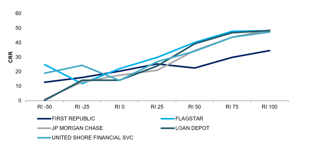 Breaking the analysis into jumbo conforming and non-conforming buckets, jumbo conforming loans serviced by First Republic have prepaid at just over 17 CRR given 100 bp of incentive while loans with comparable incentive serviced by United Shore have prepaid upwards of 53 CRR and those serviced by Loan Depot have prepaid at 58 CRR. Looking at non-conforming balances, First Republic still maintains slower in-the-money speeds, albeit more modestly, than all other servicers as loans with 100 bp of incentive have prepaid at roughly 35 CRR. Those serviced by JP Morgan Chase with similar incentive have prepaid at 45 CRR, while those serviced by Flagstar have prepaid upwards of 50 CRR.