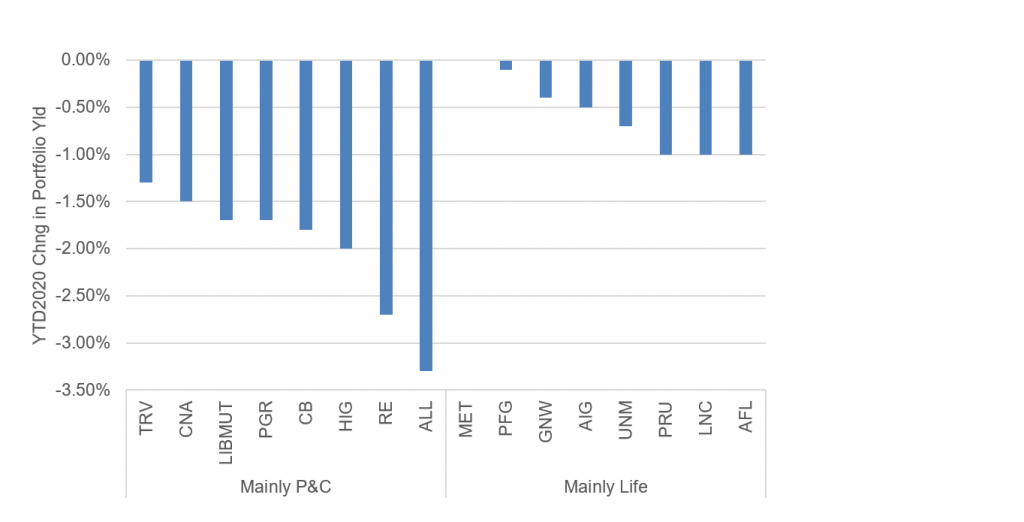 Exhibit 2: P&C portfolio yields have dropped further than life yields in 2020