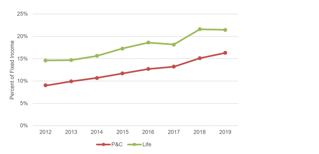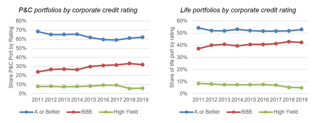 Both P&C and life insurers have battled declining yields for years by drifting down in credit. ‘BBB’ exposures between 2011 and 2019 in P&C portfolios rose from 24% to 32% (Exhibit 4). At life insurers, ‘BBB’ exposure rose from 37% to 42%. Since NAIC capital charges more than triple to go from ‘BBB’ to high yield, going further down in credit is an unlikely option. Instead, insurers are much more likely to build ‘BBB’ exposure at an even faster rate.