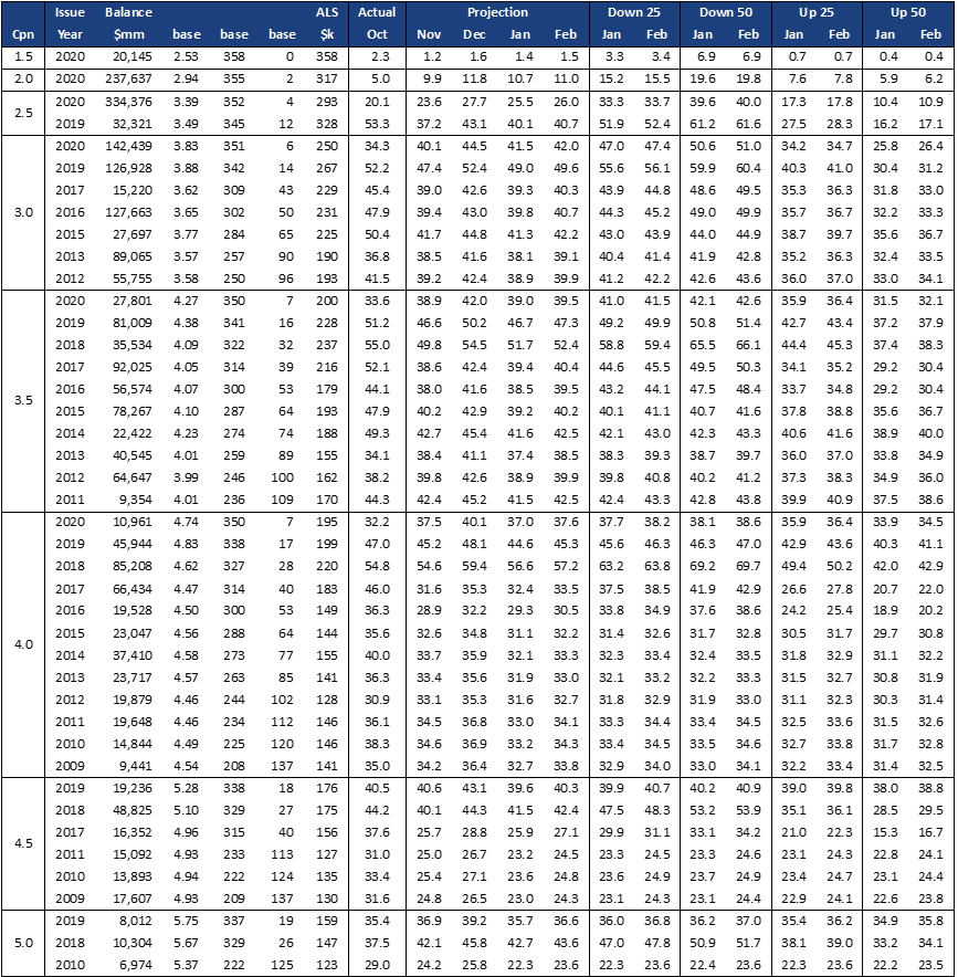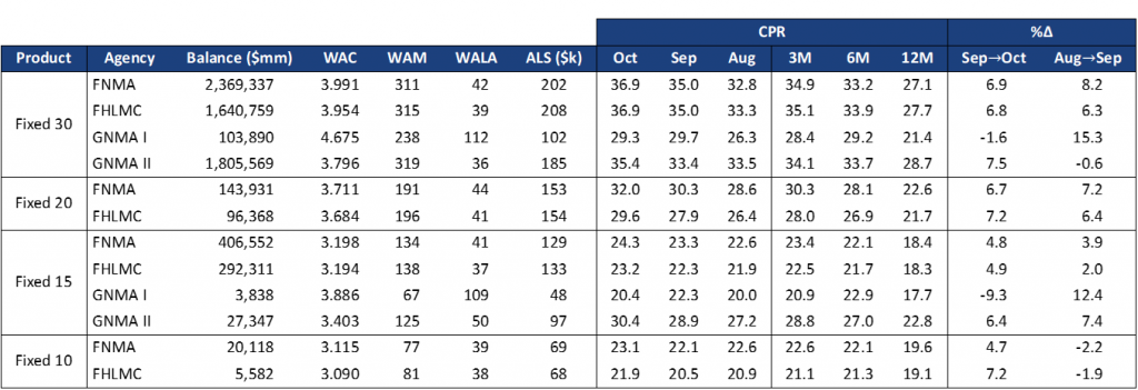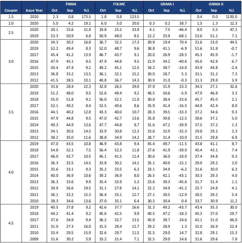 Fannie Mae and Freddie Mac 30-year prepayment speeds each increased 7% in October to 36.9 CPR. The largest increase came in the 2.5%s 2020, which jumped 33.8% to 19.8 CPR. The Fannie Mae 2019 vintage of that coupon prepaid at 53.3 CPR and the 2.5% pools issued in January, February, and March of this year have all topped 50 CPR. Within that coupon, low loan balance spec pools prepaid much slower, ranging from the high single digits for LLB and MLB pools to 23.6 CPR for Max $250K pools. But 100% Texas pools exhibited much less prepay protection than any of the other pool types, printing 41.2 CPR.