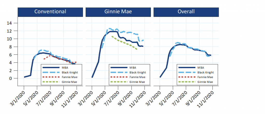Conventional and government MBS prepayment speeds surprised again in October, rising for the second consecutive month. Street forecasts projected roughly unchanged speeds last month despite an additional half business day. Housing turnover typically slows in October, and refinancing appeared ready to slow as well since the lagged MBA refinancing index had fallen. But the pandemic has kept interest in housing very high as people look for larger places for working from home. A few non-bank Ginnie Mae servicers bought out loans this in October, but the pace of non-bank buyouts remains well below the pace set by the banks since June.
