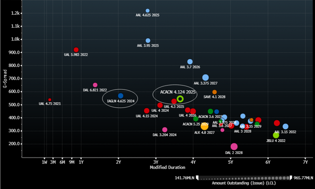 Non-US 2013 vintage aircraft EETCs are currently offering high 5% range yields as they approach the final years in their respective sinking fund maturity structures. Two highlights are British Airways (IAGLN) and Air Canada (ACACN) 2013-1 Class A certificates. While aircraft secondary values, particularly widebody, have taken a considerable hit with the drop-off in air travel due to global Covid concerns, these bonds still remain well over-collateralized and benefit from liquidity facilities covering 18 months of interest payments. The recent vaccine developments and prospects for an accelerated recovery in air travel have caused a pop in pricing, but the pass-thru certificates still offer excellent value given the underlying strength of the airlines and their relative systemic importance to air travel in their respective countries.