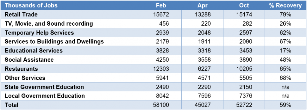 The economy has made a remarkable comeback after the spring Covid lockdowns as GDP has surged and key indicators of spending like retail sales and core capital goods orders and shipments have exceeded pre-pandemic levels. The labor market has also rebounded faster than most economists anticipated in the spring but nevertheless has lagged the bounce in GDP and spending. Payrolls have reversed just over half of the March-April losses. A breakdown by sector shows the lag in jobs is, not surprisingly, correlated with how directly the pandemic has affected each industry.