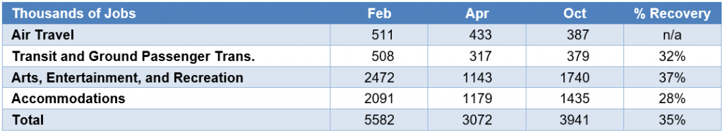 It seems useful to separate the economy into three categories, starting with industries that are not suffering from ongoing direct pandemic effects. These industries may still be well below pre-pandemic employment levels due to soft demand or other factors unrelated to the pandemic, but there is nothing about the virus that is directly depressing the sector. Mining is one example. There is no question that oil prices fell sharply due to the Covid lockdowns, which in turn curtailed domestic drilling, so mining employment has remain depressed and in fact is lower now than in April, but these are indirect effects. A number of other industries could make similar claims to a continuing Covid effect, but I want to focus purely on sectors where social distancing and government restrictions are exerting an ongoing and direct drag on activity. This category will include most sectors.