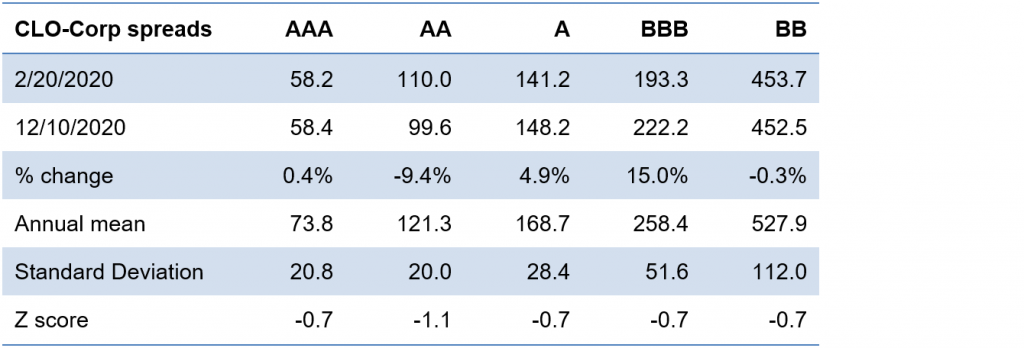 Across rating categories, ‘AA’ CLOs stand out as rich to corporate ‘AA’ on two measures. First, the current ‘AA’ CLO-to-corporate spread of less than 100 bp is well inside the February 20 spread of 110 bp. The current spread in all other rating classes is either basically flat to February 20 levels or wide. This measure does not account for differences in volatility across these spreads, however, and the pattern could be a bit random. Converting current spreads into Z-scores using the average difference over the last year and the standard deviation, the ‘AA’ CLOs again look rich, standing 1.1 standard deviations tight to the average while all other classes stand only 0.7 standard deviations tight. Both measures suggest ‘AA’ CLOs look rich to corporates.