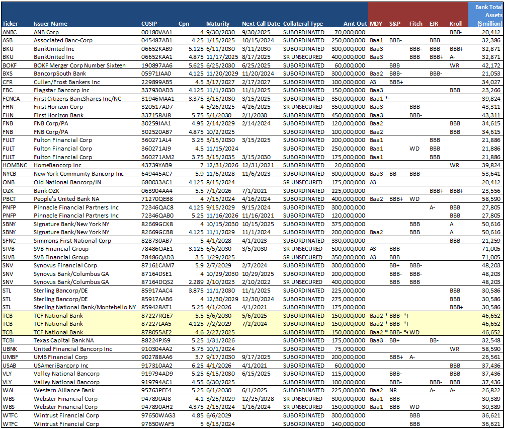 In order to identify potential merger candidates for investors to target in the corporate bond market, we ran a screen identifying large community and smaller regional banks with between $20 billion and $75 billion. Technically, BBVA USA had assets of over $100 billion, but the more likely candidates will lie in the stated range. The list was limited to banks with public debt deals with at least $20 million outstanding, which would make them more available in the secondary bond market. TCF was among the names identified through this process (Exhibit 1). Several other candidates are presented as more or less likely based on their footprint, operations, loan mix, and recent activity by management (Exhibit 1).