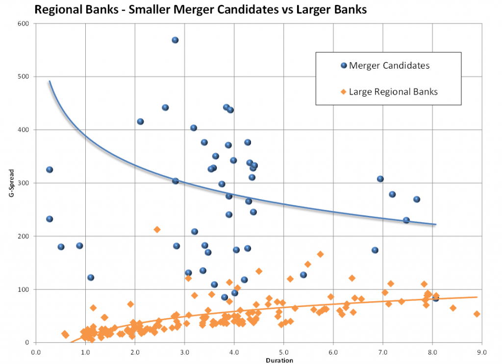 TCF Financial’s 10NC5 notes issued earlier this year (TCB 5.50% 05/06/30) are currently indicated at a G-spread of about 443 bp or a yield-to-call of approximately 4.75%. The bonds are actually trading about 5-10 bp wider than before the deal was announced. With HBAN 10-year bullets indicated at approximately +85 bp to the curve, the spread on the TCB notes should compress drastically from their current indication. It is possible that the lack of liquidity in the name explains the discrepancy in price, as the bonds have not traded since the announcement of the merger.