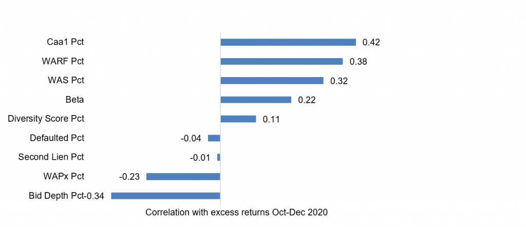The weighted average rating factor and ‘Caa1’ exposure of the portfolio correlated most strongly with recent excess returns (Exhibit 3). Managers who held portfolios with a higher weighted average rating factor or more exposure to loans rated ‘Caa1’ or below delivered higher returns. Additionally, portfolios with a lower bid depth or lower weighted average price also correlated with more recent excess returns. These relationships indicate that managers holding riskier loans continued to outperform between October and December.
