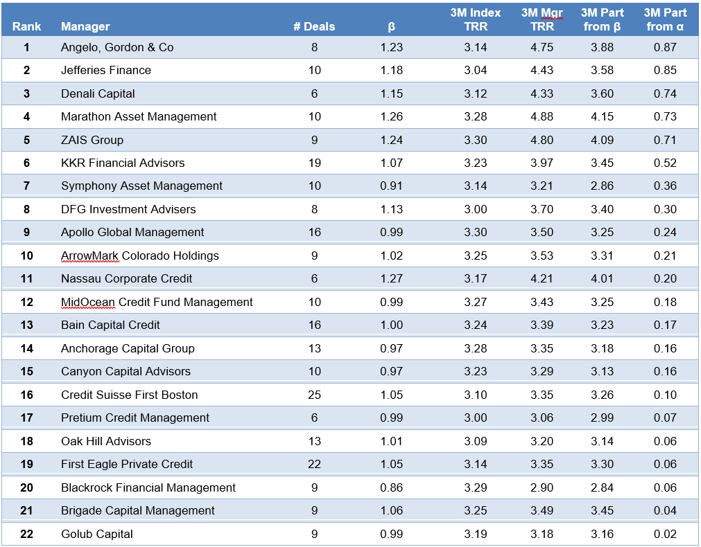 Note: Performance for managers with five or more deals tracked by APS. Performance attribution starts with calculated total return on the leveraged loan portfolio held in each CLO for the 3-month reporting period ending on the indicated date. CLOs, even with a single manager platform, may vary in reporting period. The analysis matches performance in each period to performance over the identical period in the S&P/LSTA Leveraged Loan Index. Where a deal has at least 18 months of performance history since pricing and no apparent errors in cash flow data, the analysis calculates a deal beta. The deal beta is multiplied by the index return to predict deal return attributable to broad market performance. Where no beta can be calculated, the analysis uses the average beta across each manager’s active deals weighted by the average deal principal balance over time. Any difference between performance attributable to beta and actual performance is attributed to manager alpha.