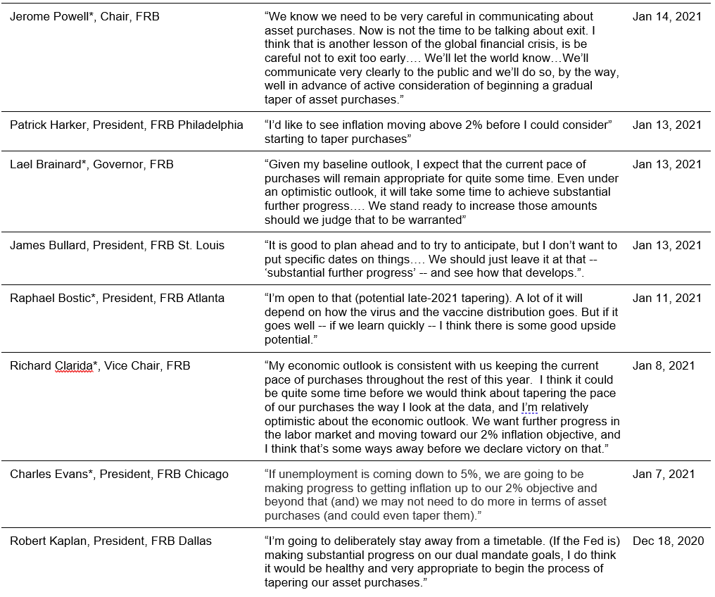Eight Fed governors or bank presidents have weighed in since mid-December on the topic of tapering, including five of the 11 members of the FOMC eligible to vote in 2021 (Exhibit 2). All have avoided timelines and largely focused on linking tapering to progress on inflation and employment. Powell has talked down the possibility of tapering, and the market has reversed some of its move to higher rates. But the broad public remarks are a clear sign of active discussion at the board and among the banks and system staff likely about what “substantial further progress” will mean in practice.