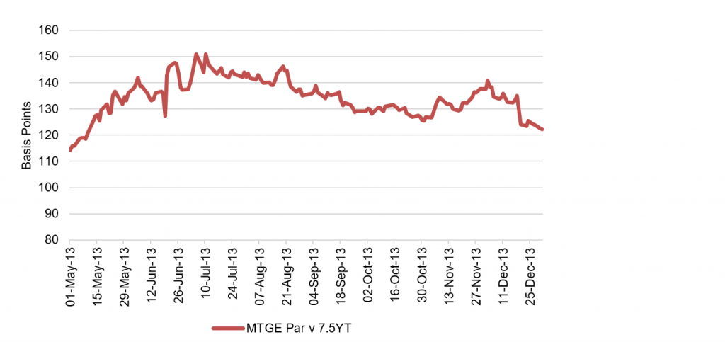 When then-Fed Chair Ben Bernanke first indicated on May 22, 2013, that the Fed might pull back on QE, the impact came in both higher rates and wider spreads. Higher rates arguably reflected market belief that the Fed saw stronger growth than the market had expected. Wider spreads reflected concerns that a pull back in QE would reduce demand for risk. In any event, the impact was swift and significant. Within a month, US 10-year rates moved from 1.93% to 2.53% (Exhibit 3A). Nominal spreads on par 30-year agency MBS from 128 bp to 146 bp (Exhibit 3B). And implied volatility in 3-month options on 10-year swaps moved from 34% to 39%.