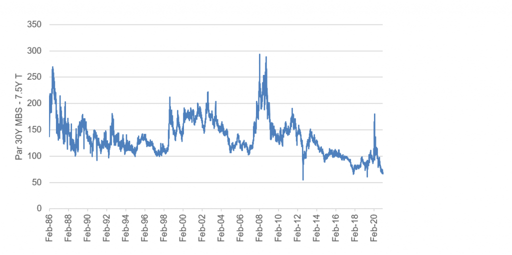 Exhibit 1A: Par 30-year agency MBS spreads are near 35-year tights