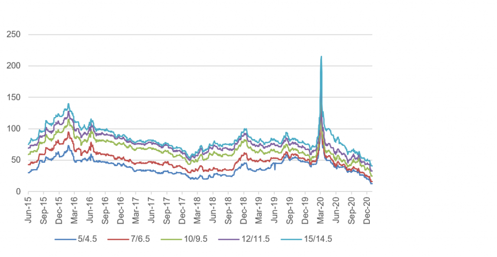 Consumers in aggregate are coming out of 2020 with a $5 trillion gain in net worth. Aggregate savings are up, home values are up and investment portfolios are up. Consumers have not added much debt. Although there is an underlying distribution of haves and have nots, the aggregate consumer balance sheet is strong. Corporate balance sheets have taken on substantial amounts of debt and will need earnings to rebound for either debt-to-EBITDA or EBITDA-to-interest-expense to drop back to better levels. Credit in the next few months could see some volatility as Covid begins forcing shutdown of some economic activity and distribution of vaccines potentially hits some logistical potholes. But distribution and vaccine uptake through next year should put a floor on fundamental risk with businesses and households most affected by pandemic—personal services, restaurants, leisure and entertainment, travel and hotels—bouncing back the most.