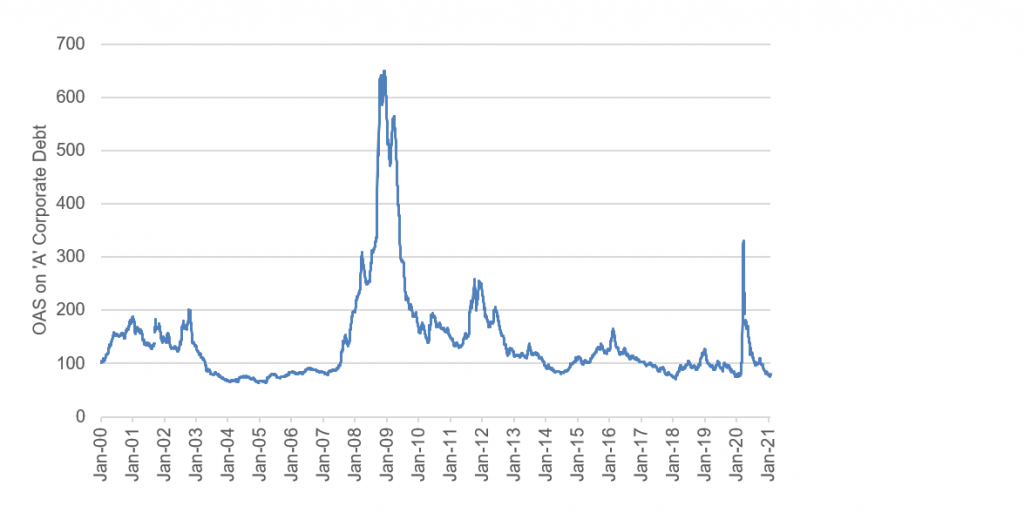 Exhibit 1C: Spreads on ‘A’ corporate debt have reached 20-year tights