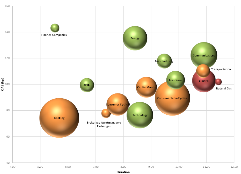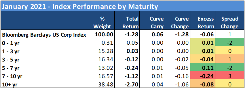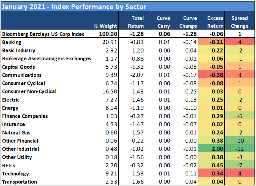 Spreads closed the month little changed in aggregate (Index OAS +1 bp), despite the fact that the market appeared to remain in a “risk-on” posture for credit. The IG Corporate Bond Index generated -0.06% excess return for the month, while total return was -1.28% with the sell-off in US Treasuries.