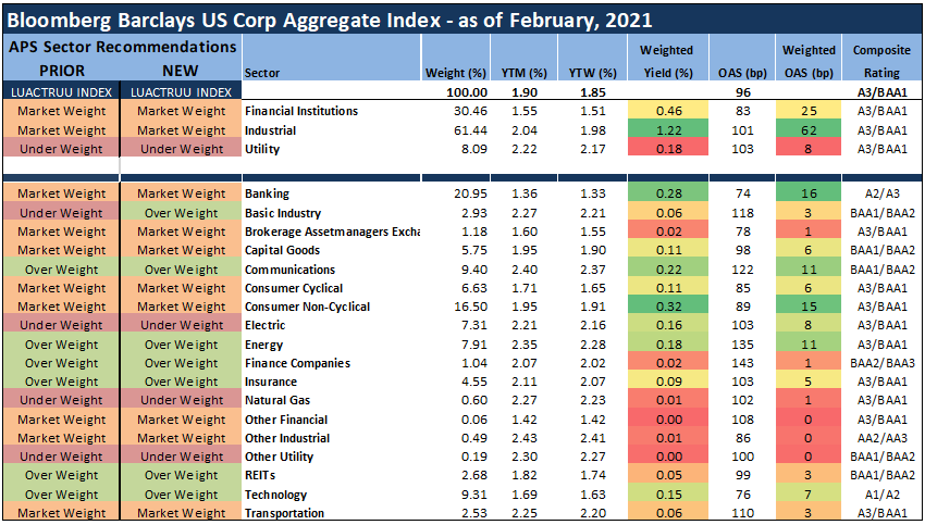 A summary of how APS expects sectors within the investment grade index to perform for the next several months on an excess return basis (total return net of commensurate UST return) are presented in Exhibits 1 and 2. These weightings serve as a proxy for how we recommend that portfolio managers should position their holdings relative to the broad IG corporate bond market.