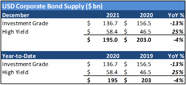 The IG new issue calendar handily beat expectations for the month, but failed to outpace January 2020. Total volume was $137 billion versus $157 billion in the prior year. Debt launches in the month were bolstered by a jumbo deal of $10 billion from 7-Eleven (SVELEV: Baa2/AA-*-) and a particularly active month from the bank/finance sectors – first by yankee issuance and later by the big US money center banks exiting their earnings blackout periods. Overall corporate debt placement year-over-year was flatter when taking into consideration the big gains over the prior year in High Yield and the EM, with HY new issue volume of $58 billion (+25%) and a record month for emerging markets.