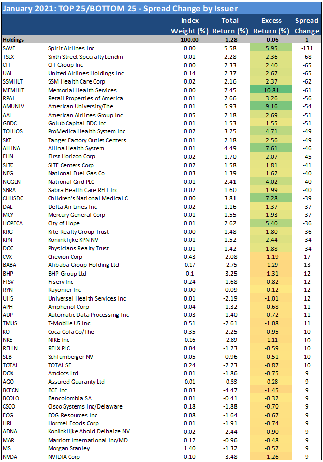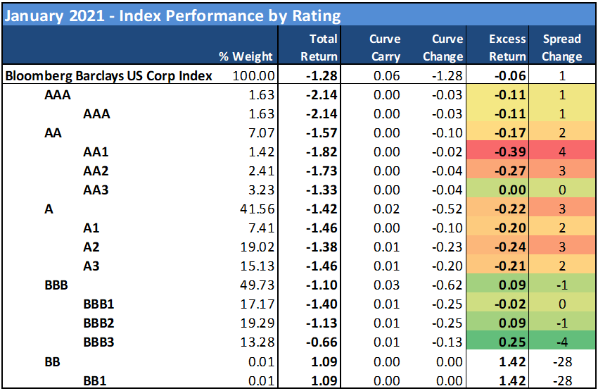 REITs (0.45% excess return) and finance companies (0.29%) generated the top credit returns in the Index amidst a flat month, as the appetite for low BBB credit persisted. Rounding out the top 5 sector performances for January were utilities (0.25%), natural gas (0.24%) and basic industry (0.22%), demonstrating a very mixed approach to credit risk. For the first time in several months, energy (0.01%) failed to land among the top sectors within the index, as the energy trade appeared to take breather; although much of that flat performance can be attributed to the reaction to S&P’s decision to put several of the energy majors on watch negative late in the month. Citing energy transition, price volatility and pressures on profitability, the rating agency placed nine oil and gas companies on review for downgrade, which it expects to resolve in the next several weeks, while also affirming the ratings and revising the outlooks on two companies to negative from stable (BP and Suncor). The five worst performances in January included communications (-0.38%), technology (-0.34%), banking (-0.21%), consumer cyclical (-0.08%) and capital goods (-0.05%), as investors appeared to continue to seek out higher-yielding opportunities even as aggregate spreads bumped along the bottom throughout the month.
