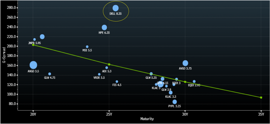 DELL now trades on top of AVGO in the 10-year part of the curve, as the previous +20 bp spread differential between the two credits has collapsed. However, in the long end of the curve DELL 8.35% 7/15/46 bonds trade 114 bp (g-spread) behind AVGO 3.75% 2/15/51 bonds. This large spread differential takes into account the high dollar price associated with DELL’s bonds. Assuming 1.5 bp of additional spread per each dollar differential between DELL and AVGO bonds ($52) and no additional spread differential behind AVGO as the credits are trading flat to each other in the 10-year part of the curve, that would put fair value on the DELL 2046 bonds at roughly +243 bp (g-spread). That translates to roughly 30 bp of upside from current trading levels.