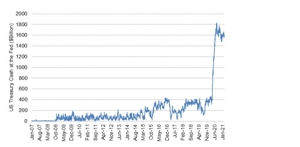 Exhibit 1: Pandemic triggered a historic rise in the Treasury’s cash balance