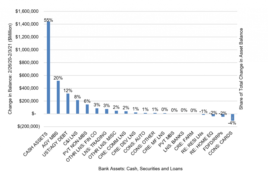 Smaller amounts have gone into loans and other securities. It is worth noting that while total bank assets have gone up nearly 15%, loan and lease balances have gone up less than 3%.
