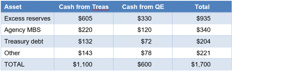 • More than $1.44 trillion or 55% of purchases has gone into cash assets, including excess reserves held at the Fed