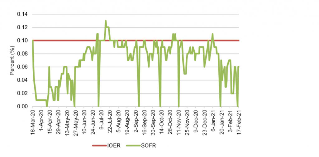 Money market mutual funds, Fannie Mae and Freddie Mac, broker/dealers and others that cannot deposit excess cash at the Fed have been forced to compete with banks in markets where demand overlaps—mainly the short end of the Treasury curve. This has helped keep short Treasury yields low, especially in Treasury bills. And low bill yields have forced many of these non-banks into other markets, such as Treasury repo. To make matters worse, Fannie Mae and Freddie Mac’s regulator also proposed rules in December that gave the GSEs significant incentives to move a portion of their month repo investments from MBS to Treasury debt, and the GSEs began acting on the proposed rules in January. The Secured Overnight Financing Rate, or SOFR, which reflects rates in recent months on more than $900 billion in daily Treasury repo, dropped well below IOER right after the start of pandemic when many investors grabbed cash and invested in the safest assets, including Treasury repo (Exhibit 6). SOFR hovered a few basis points below IOER through most of the summer and fall. But since the start of January, the gap to IOER has widened. That brings the discussion back to Treasury cash balances: as the Treasury has put cash back out into the market and drawn down the supply of bills, rising cash has had to chase a declining set of investors that need to finance Treasury bill holdings, driving down Treasury repo rates.