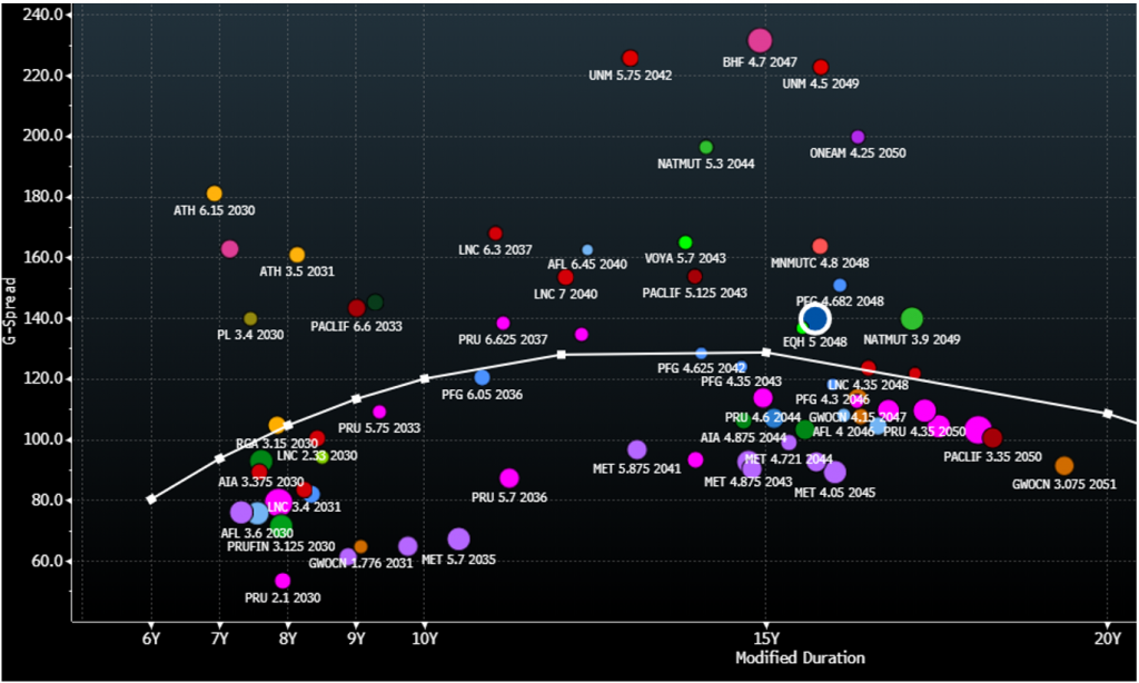 Spun out of AXA three years ago, Equitable Holdings Inc. (EQH) is a well-diversified standalone insurance company, specializing in individual life and retirement offerings. The biggest credit risk with EQH has traditionally been on the liability side of their legacy variable annuity portfolio with guaranteed benefits, though they are taking steps to mitigate this risk and have been establishing better risk management policies since their spin-off. Both Moody’s and S&P recently raised their outlook on EQH as the actions taken significantly improve capital adequacy. The EQH 48s offer good risk compensation in the long-end of the insurance curve.