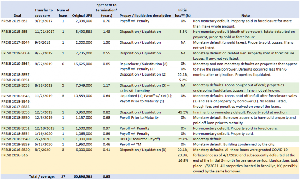 There are 27 loans to date that have been terminated or bought out of FRESB deals due to non-performance (Exhibit 1). Some key points: