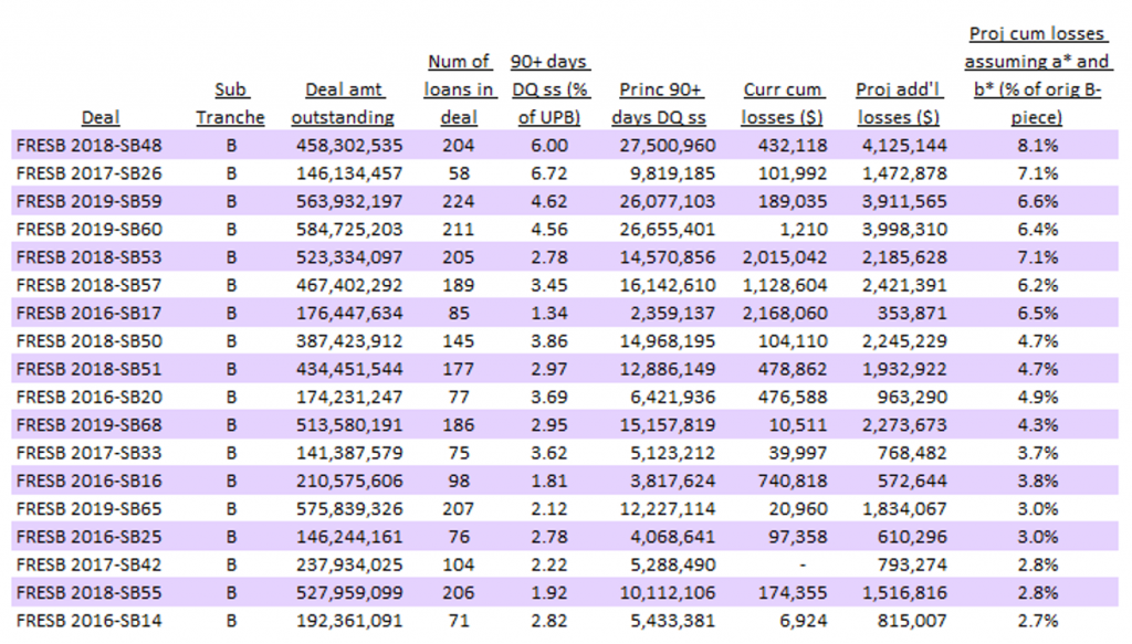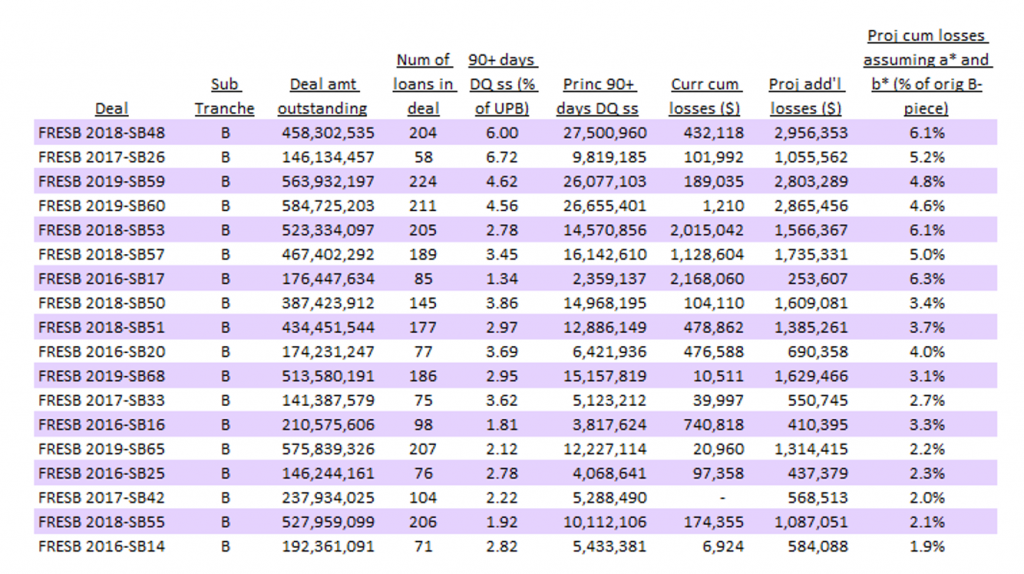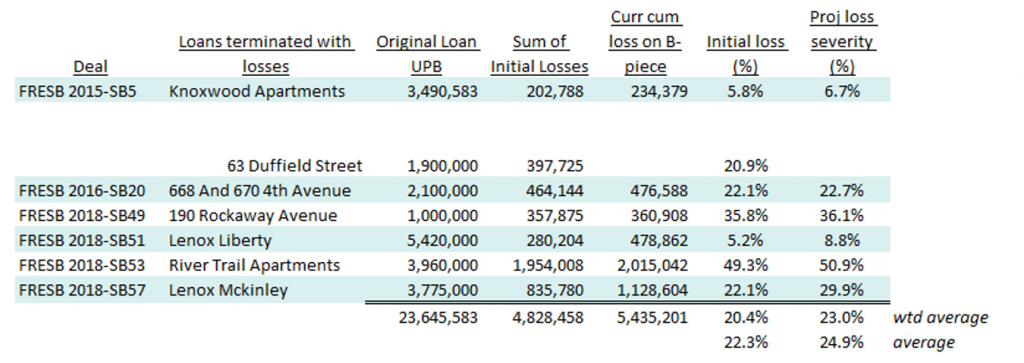 Obviously, the cumulative losses in these FRESB B-pieces are a little bit higher than the known initial loss amounts on the terminated loans, probably due to the inclusion of additional expenses. These projected loss severities are 25% on average for the loans with losses.