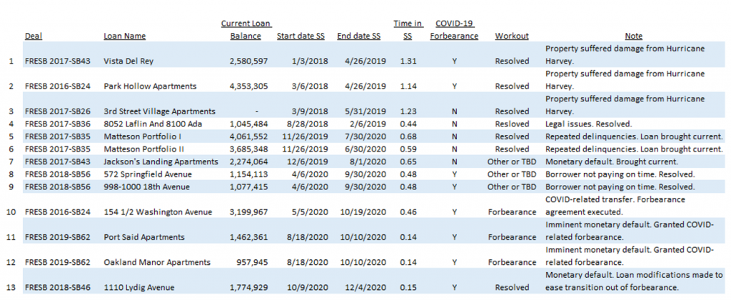 Projecting future losses based on historical performance is always fraught with danger, but particularly so when the period spans one from “normal” to “crisis”. There are 145 Freddie Mac small balance loans currently in special servicing ($348 million in UPB) across roughly 80 FRESB deals (Exhibit 6). These loans are about evenly divided between those that have been in Covid-19 related forbearance (71 loans, $168 million UPB) and those that have not (74 loans, $181 million UPB). All of these loans in special servicing remain in their pools, with the amount of time in special servicing to date ranging from two months to 18 months.