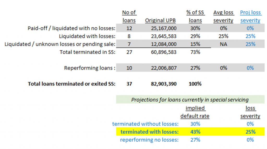 - Seven of the terminated loans (26%) have losses that cannot yet be determined. Two of the loans indicate that the property has been liquidated, but losses, if any, are not yet listed. The five loans (in SB58) have been paid off in the deal but liquidations of the properties are still pending, so eventual losses, if any, cannot yet be estimated.