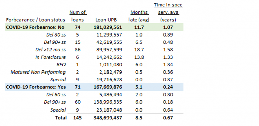 - Of the 13 loans listed in Exhibit 2, 3 of them exited special servicing by entering Covid-related forbearance. It seems likely that would have qualified for forbearance earlier but did not apply. Loans in forbearance are not in special servicing as long as they are performing – meaning they are not yet required to make payments or they are performing during the repayment period. From here forward we drop those 3 loans and assume only 10 loans have exited special servicing as reperforming loans.