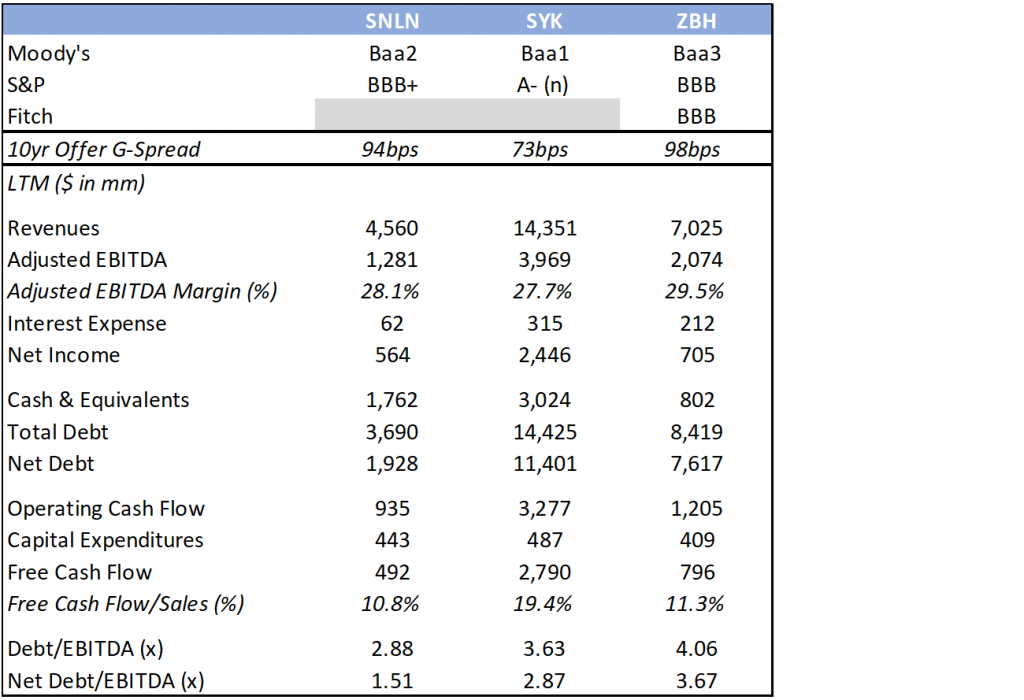 SNLN has a stated net leverage target in the 2.0x-2.5x range. While the company is currently below its target range, we expect net leverage to rise as it uses cash raised in its debt offering to fund its acquisition strategy. SNLN focuses on tuck-in size acquisitions and recently closed on a $240 million acquisition of Extremity Orthopedics (1/4/21). Over the past 2 years, SNLN has completed 9 acquisitions, of which financial terms were disclosed for only two. The current ratings and respective stable outlooks at Moody’s and S&P factor in management’s acquisition strategy and leverage target. An increase in net leverage to management’s stated range will not impact existing ratings or outlooks. SNLN’s track record of maintaining strong credit metrics coupled with its disciplined approach to acquisitions lend to the existing ratings.