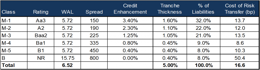 However, even in this structure, investors rely on the issuer to be able to pay the spread on the notes over and above the benchmark index. In the JPM structure, the funds to pay those spreads are disbursed by the bank on a monthly basis. In the case of a smaller issuer with a lower credit rating, issuers could potentially pre-fund a reserve account where they would deposit cash to cover some portion of the expected interest payments in an effort to offset some amount of the counterparty risk. Other solutions for lower rated counterparties could be partially hedging the counterparty risk with credit default swaps or attaching a financial guarantor to the interest payments. While the conventional wisdom to date is that private CRT issuance would be limited to only the largest institutions there may ultimately be ways for others to tap the market.