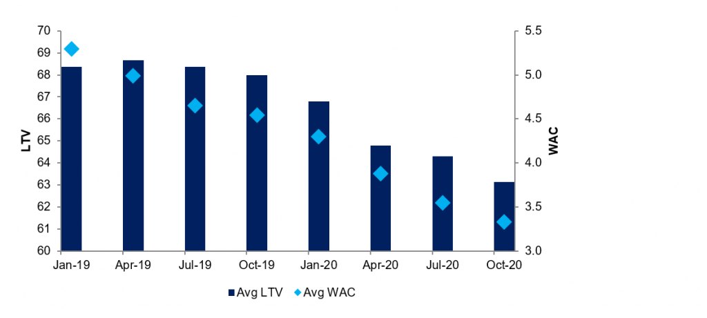 Looking at the attributes of investor loans recently delivered to the enterprises shows that much of their recent production is comprised of lower WAC lower LTV loans that may find a home in private-label deals if they begin to curtail their purchases. In the fourth quarter of last year, the enterprises collectively originated over $36 billion of investor loans, representing slightly less than 5% of their total issuance. The loans had an average LTV of 63 and an average WAC of 3.32% suggesting that a considerable swath of these loans could be securitized efficiently in private-label deals. Obviously fueled in no small part by the rally in interest rates, average WACs, and LTV ratios across investor loans issued by the agencies have both come down over time, potentially setting up for a smooth transition for the private market to take some share of this production (Exhibit 2).
