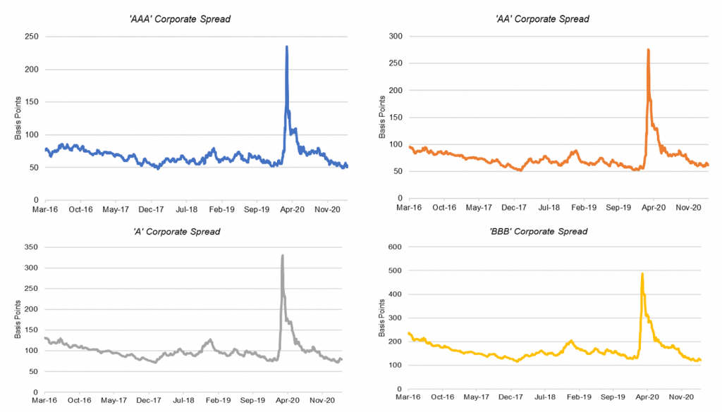Consumers in aggregate are coming out of 2020 with a $12 trillion surge in net worth. Aggregate savings are up, home values are up and investment portfolios are up. Consumers have not added much debt. Although there is an underlying distribution of haves and have nots, the aggregate consumer balance sheet is strong. Corporate balance sheets have taken on substantial amounts of debt and will need earnings to rebound for either debt-to-EBITDA or EBITDA-to-interest-expense to drop back to better levels. Credit should improve as warmer weather and better vaccine distribution allows more opening of economic activity. Distribution and vaccine uptake through the end of 2021 should put a floor on fundamental risk with businesses and households most affected by pandemic—personal services, restaurants, leisure and entertainment, travel and hotels—bouncing back the most.