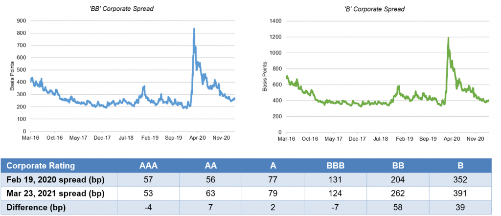 With the most transparent credit spreads largely back to pre-pandemic levels, investors can go around the table on whether the market has fully priced in potential growth and earnings upside. But one thing that is clearly different is the efforts of the Fed. QE and its knock-on fueling of bank investment will almost surely absorb the market’s safest assets for the balance of this year and crowd remaining capital into risks a tier or two above their normal habitat. The lower tiers of credit should see some of that new capital and should outperform higher rated debt.