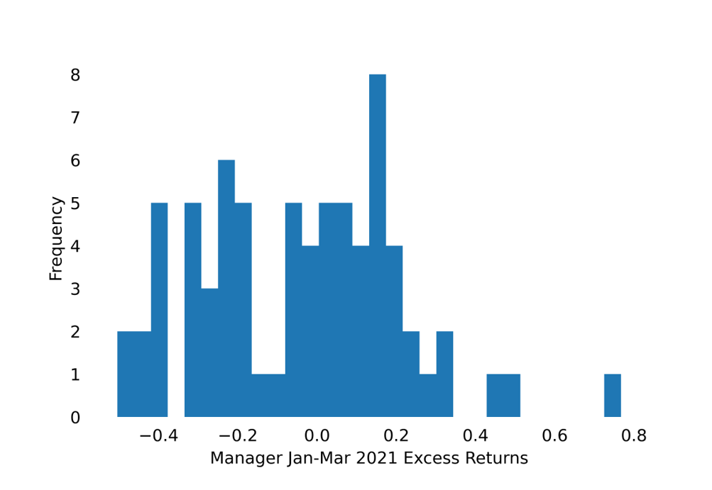 Exhibit 2: Nearly half of managers outperformed the index between January and March