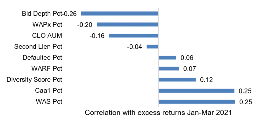 The bid depth and weighted average spread of the portfolio correlated most strongly with recent excess returns (Exhibit 3). Managers who held loans that were less liquid or had higher weighted average spread delivered higher returns. Additionally, higher exposure to ‘Caa1’ loans correlated with more recent excess returns. Interestingly, the larger CLO manager’s AUM, the marginally worse its performance. Overall, managers holding riskier loans tended to outperform.