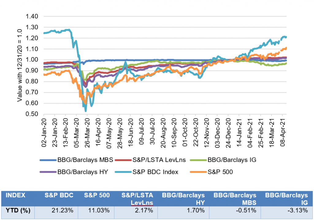 Valuations on private lenders have moved up since the beginning of the year more than 21%, roughly 10 percentage points more than the S&P 500 (Exhibit 1). Even after accounting for BDCs ability to lend to small and medium companies by using up to $2 of debt for every $1 of equity, the implied 7% gain on their loan portfolios—a lower bound since some BDCs run lower leverage—is still strong. BDCs and their underlying portfolios have outdistanced the unleveraged returns on leveraged loans and high yield, as well as returns in MBS and investment grade corporate debt.